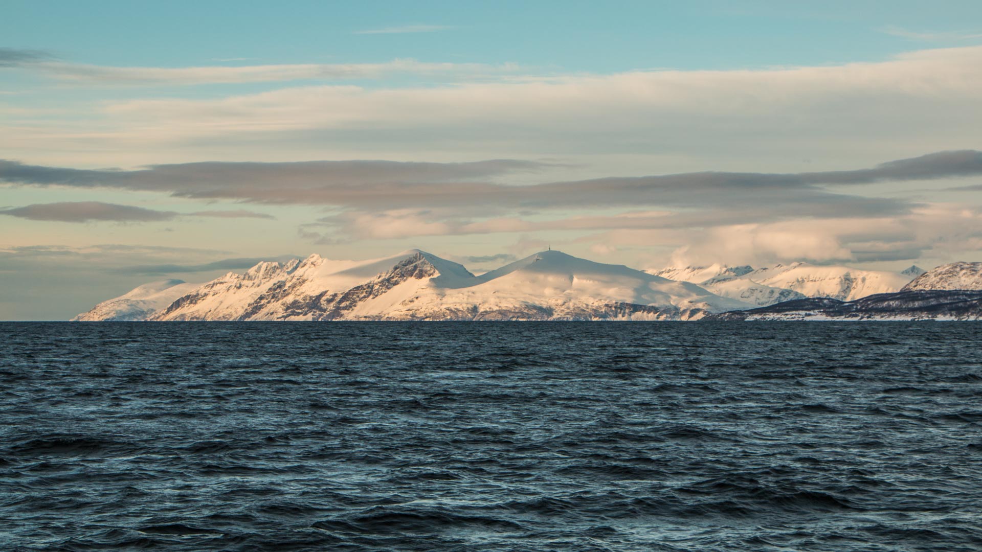 Schlechtwettertag in Tromsö. Wir sind alle heilfroh im Hafen von Tromsö geschützt vor dem Seegang zu liegen. Selbst hier im Hafen stürmt und schaukelt es stark. Der Mechaniker ist da und auch das Problem ist schnell gefunden. Es ist nichts Ernstes! Die Ersatzteile kommen morgen früh und dann kann es weitergehen. Das Wetter spielt uns voll in die Karten! Heute schlecht und morgen ab Mittag gut. Somit verlieren wir keine Tourentage. Ganz im Gegenteil wie sich später herausstellen sollte. Oyvind hat uns den „Seebären“ organisiert, welcher nicht nur Boote abschleppt, sondern uns auch zu Skitourenzielen mit seinem Kleinbus fährt. Nachmittags um 15 Uhr starten wir auf Skitour, da es nun ganz im Westen aufzieht. Alleine die Autofahrt ist ein Erlebnis und die Insel auf der wir sind, ist unglaublich wild. Den Gipfel erreichen wir nicht ganz, aber das ist heute kein Problem. Alle anderen Skitouren Boote stecken in geschützten Häfen fest und können keine Touren unternehmen. Wir konnten hingegen die raue Seite Nordnorwegens erkunden und trotzdem mit Ski unterwegs sein. Glück muss man haben, Danke Murphy!