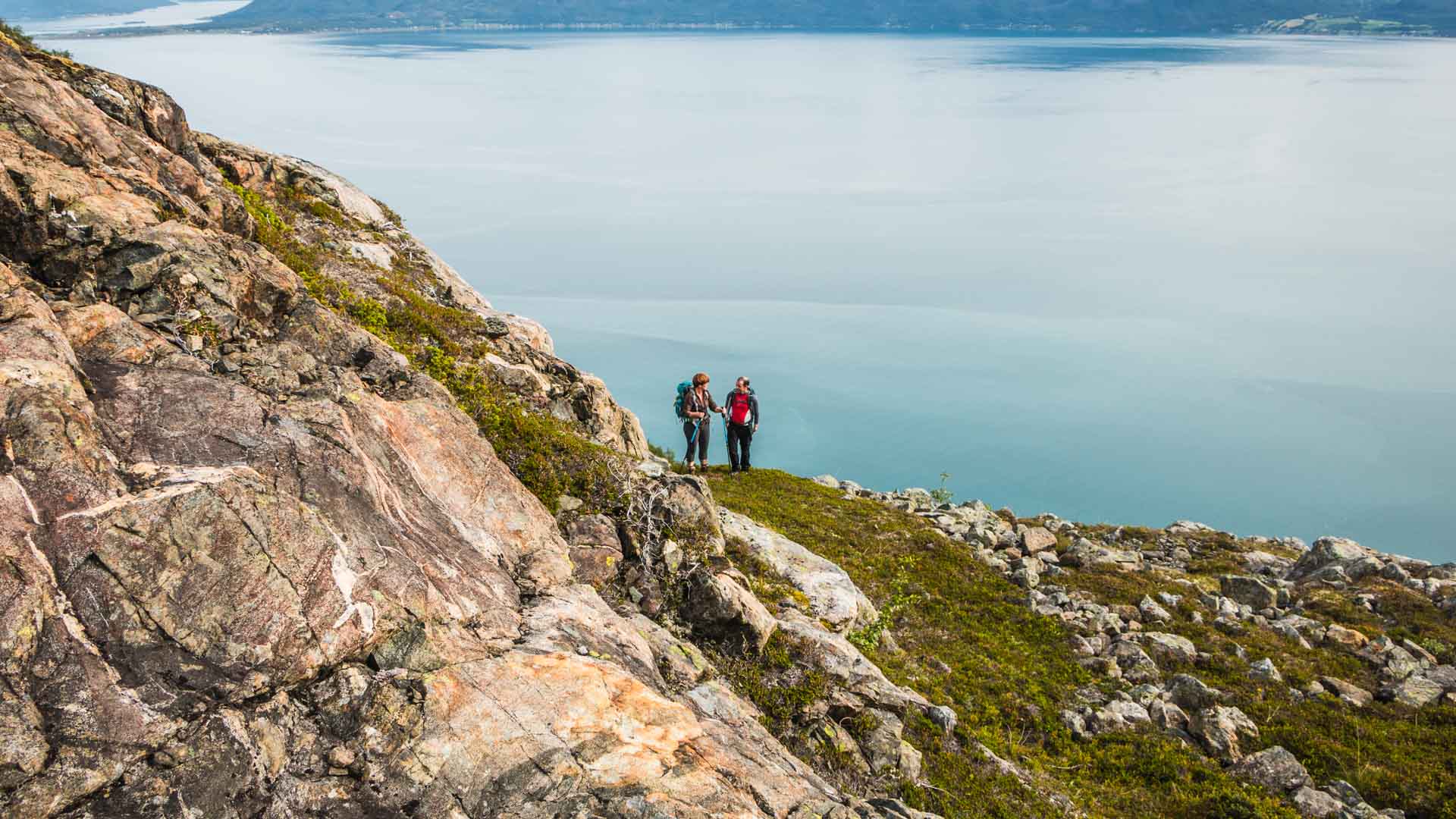 Die Fähre bringt uns von Lyngseidet nach Olderdalen über den Lyngenfjord. Alleine die Fährfahrt lohnt sich bereits. Genau auf der gegenüberliegenden Uferseite erwandern wir heute die Hochebene unter dem Gipfel des Storhaugen. Die Steilküste der Lyngen Berge und Gletscher fesselt unseren Blick. Nach den Birkenwäldern und Blaubeerstauden wird es karger und karger. Ein schönes Plateau lädt zum Staunen und Rasten ein. Wenn alles passt grillen wir am Lagerfeuer ein paar „Pölsa“ (norwegische Würste). Die Szenerie könnte nicht eindrucksvoller sein.